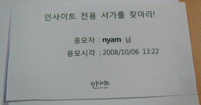성황리에 마친 ‘인사이트 전용 서가를 찾아라’ 이벤트의 당첨자를 발표합니다. 모두 22분께서 참여해주셨네요. 감사합니다.이번에 사용한 추첨 방법은 IT 전문 출판사답게 ‘수작업으로‘ 했는데요. 먼저 응모하신 한 분 한 분 응모 용지를 만들고, 반으로 접어, 해프닝 님의 예쁜 방울 털모자에 송송 집어넣고 저희 식구들이 한 분씩 뽑았습니다.