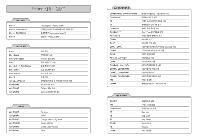 더불어, 이전 판을 구입하셨거나 이클립스에 익숙하셔서 이 책을 사지 않을 독자들께도 뭔가 도움이 될 일이 없을까 하여 책 뒤에 붙어 있는 단축키 일람표를 PDF로 공개합니다. 출력하셔서 파티션에 붙여두시면 단축키 찾느라 헤멜 필요가 없으리라 생각합니다. 많이 사용해주세요. ^^