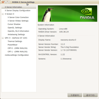 우분투 사용자 모임()에서 듀얼 모니터로 검색해서 얻은 정보로는, Nvidia 전용 드라이버가 설치되었기 때문에 기본 설정 프로그램이 손을 놓아버린 모양입니다. Nvidia 그래픽카드를 설정하려면 시스템 -> 관리 -> Nvidia X Server Settings라는 좀 무서운 녀석을 실행… 이라고 생각했으나 윈도에서 보던 화면과 비슷하네요.