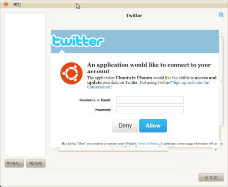 프로그램 -> 인터넷 -> Gwibber 소셜 클라이언트를 실행하니 역시 계정 추가 화면.