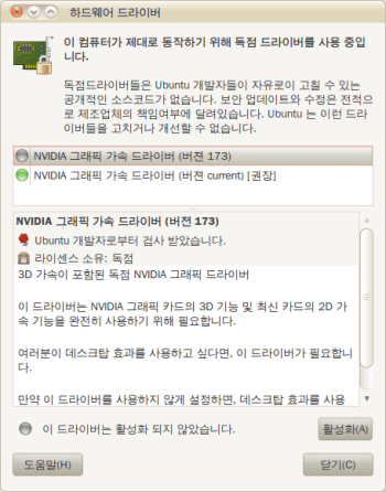 그렇지만 Nvidia나 ATI의 그래픽카드 드라이버는 기본 설치에서 제외! (용량보다는 라이선스 문제때문이라고 합니다.) 아까 깜박인 아이콘을 눌러보니 드라이버 설치 창이 뜹니다. (음? 내가 드라이버 파일을 찾을 필요가 없는 거야?)