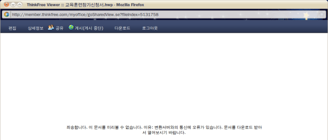 hwp 파일을 업로드한 후(이때 파일 이름에 특수문자가 섞여 있으면 안됩니다), 파일을 클릭했더니!