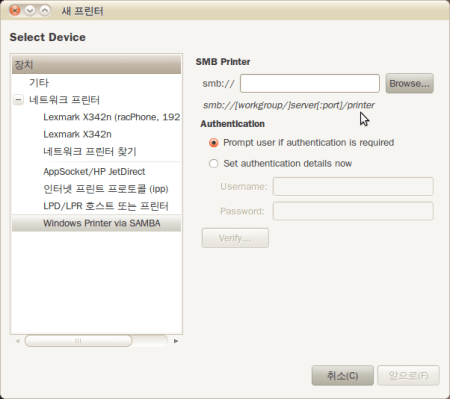 사무실 프린터는 윈도 컴에 연결된 공유 프린터이므로 ‘Windows… ‘ 어쩌구를 누른 후 Browse 버튼을 눌렀습니다.