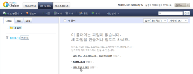 간단히 회원 가입을 하고(개인 정보를 묻지 않아서 맘에 들어요!), 웹 오피스에 들어갔습니다. 기본적인 화면은 일반 웹하드와 크게 다르지 않네요.