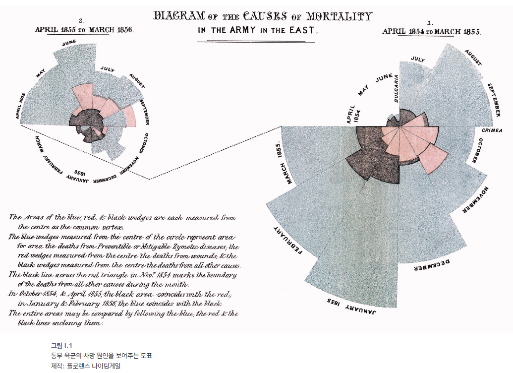 정보디자인은 전혀 새로운 것이 아니다. 초기 동굴벽화에서부터 오늘날 데이터 시각화에 이르기까지, 인간은 정보 전달을 위해 그림 묘사를 활용해 왔다. 그 효과는 빅토리아 시대에서도 찾아볼 수 있다. 그림 1.1은 크림전쟁 당시 영국군의 사망 원인을 보여주기 위해 플로렌스 나이팅게일이 제작한 인포그래픽이다. 이 인포그래픽은 군인의 건강과 위생을 우려하는 목소리에 침묵하던 의회에 제출되었고, 그 결과 질병 확산에 대한 생각을 바꾸는 계기가 되었다.