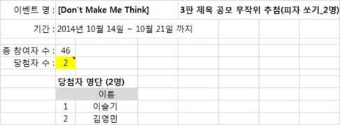 여러 개의 아이디어를 내주신 분들도 많으셨고, 결정된 제목과 아주 비슷한 응모작이 많았으나, EunaBea 님이 내주신 ‘사용자를 생각하게 하지 마라’로 결정했습니다. EunaBea 님이 제안하신 제목은 최종 제목과 토씨(~라) 하나만 다릅니다. 정말 감사드립니다.
