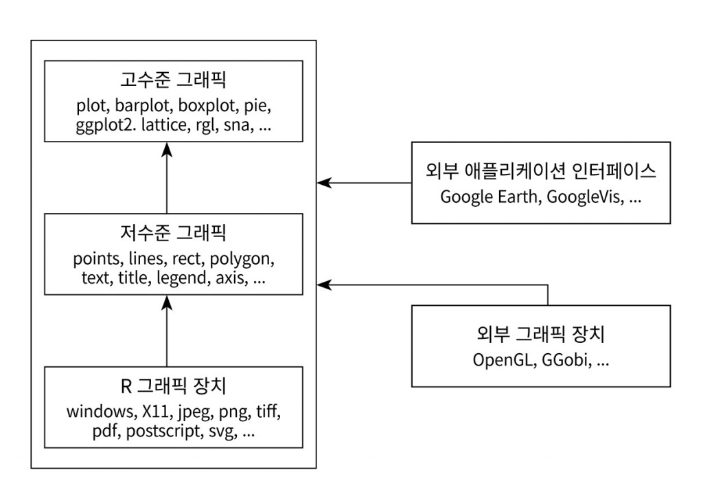 통계 및 데이터 분석용 언어인 R은 시각화에 대한 상당히 많은 기능을 포함하고 있습니다. 아래 그림은 R에서 다루고 지원하는 시각화 함수 및 패키지, 그래픽 장치에 대한 요약입니다. 간단해 보이지만, R 데이터 시각화가 얼마나 강력한 힘을 갖고 있는지를 담고 있습니다.