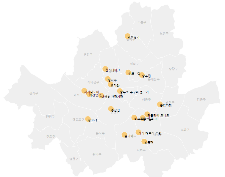 그리고 박은정 님께서 블로그에 맛집 지도 그리는 방법을 공유해 주셨습니다 ! 데이터를 표현하는 데 관심 있는 분들께 아주 도움이 되는 글입니다. 여러 버전의 맛집 지도가 나오길 기대해 봅니다*_*