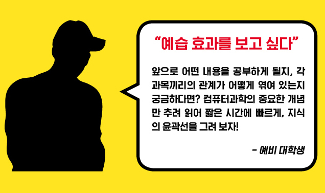 컴퓨터학과에 진학할 예비대학생이라면, 본격적인 공부를 시작하기에 앞서 앞으로 무엇을 배울지 이 책을 통해 가늠해 보세요. 가벼운 마음으로 읽으며 낯선 단어들과 친숙해지고, 이런 흐름과 기술이 있다는 것을 알아보세요. 기술 사이에, 과목 사이에 어떤 관계가 있는지를 알게 되면 ‘이 과목을 왜 배우는지’, ‘지금 배우는 것이 어디에 쓰이는지’, ‘학습 과정의 다음 단계는 무엇인지’에 대한 답을 얻을 수 있을 겁니다.