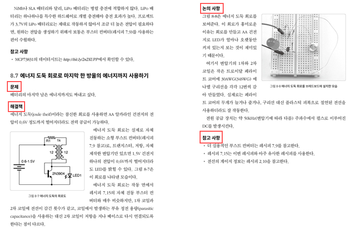 특히 사이먼 몽크는 전자공학 분야 집필서의 대가답게 실습을 하다가 마주칠 수 있는 문제점을 미리 예측하고 그에 대한 해결법도 제시하고 있습니다. 특히 모든 장은 [문제-해결책-논의 사항-참고 사항]으로 구성되어 있는데요, 메이커가 맞닥뜨렸을 문제가 무엇일지 제시하고 그에 대한 해결책을 자세히 설명합니다. 그리고 그에 따른 논의 사항을 소개하면서 전력을 계산하거나 해결책을 따를 때의 변수 등에 대해 꼼꼼히 체크합니다. 마지막으로 참고 사항에서는 더 알아두면 좋은 정보나 참고할 만한 사이트 등을 추가로 적어놓았습니다. 부품 리스트, 아두이노와 라즈베리 파이의 핀 배열, 단위와 접두어를 정리해 놓은 부록까지 살펴보면 책 곳곳에서 세심함이 느껴진다는 것을 깨달을 수 있습니다.