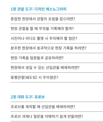 이 모든 도구에 앞서 무엇보다 중요한 것은 ’마음가짐’이다. 사용자의 세계를 바라보는 깊이 있는 마음과 적절한 자세를 갖추고 있다면 커피 한잔을 들고 그들의 세계로 들어가 대화를 나누는 것만으로 깊은 통찰을 얻을 수도 있다. 이 책을 활용하는 독자들이 사용자의 세계로 들어갈 준비를 하는 데 조금이나마 기여할 수 있다면 우리에게는 큰 보람이 될 것이다.
