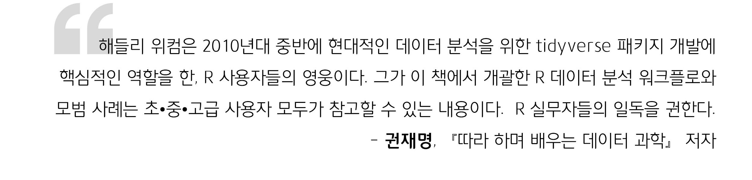 데이터 과학 분야의 살아있는 전설이자 R 사용자들의 영웅으로도 불리는 해들리 위컴의 대표작인 《R for Data Science》의 번역서를 소개합니다. 개럿 그롤문드와 함께 쓴 이 책은 저자들의 경험뿐만 아니라 R 커뮤니티의 많은 사람과 나눈, 수많은 (직접 및 온라인) 대화의 결과물입니다. 한국어판을 기다리시다 출판사로 문의하시는 분들도 참 많으셨는데요. 드디어 발간됩니다.
