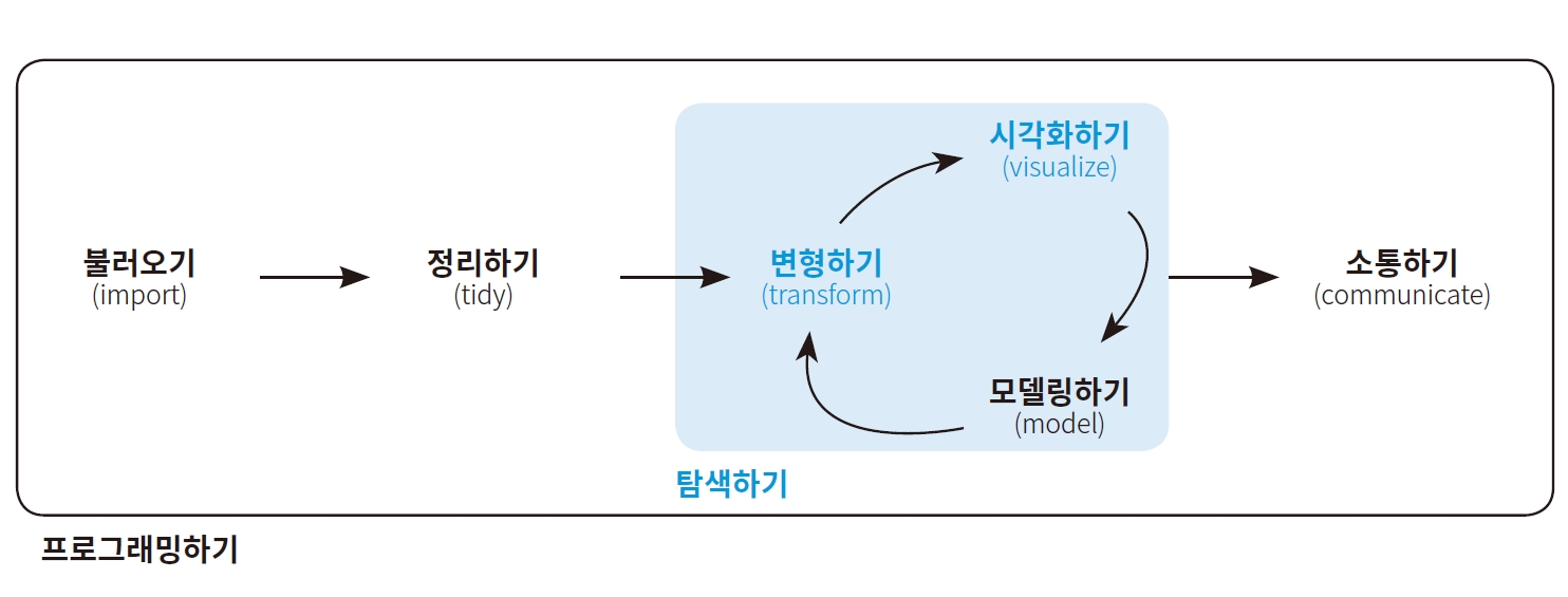 이 주요 도구를 사용하는 방법은 아래 그림처럼, 데이터를 불러오고(import) 정리한 후(tidy) 변형(transform), 시각화(visualize), 모델링(model)을 반복하여, 의미 있는 분석을 한 후에 이를 남들과 공유(communicate)하는 것을 말합니다.