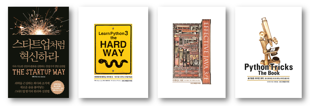 다음은 중고급 프로그래머를 위한 책입니다. 이번에는 한 권이 아닌 두 권! 바로 『이펙티브 자바 3판』과 『슬기로운 파이썬 트릭』입니다.