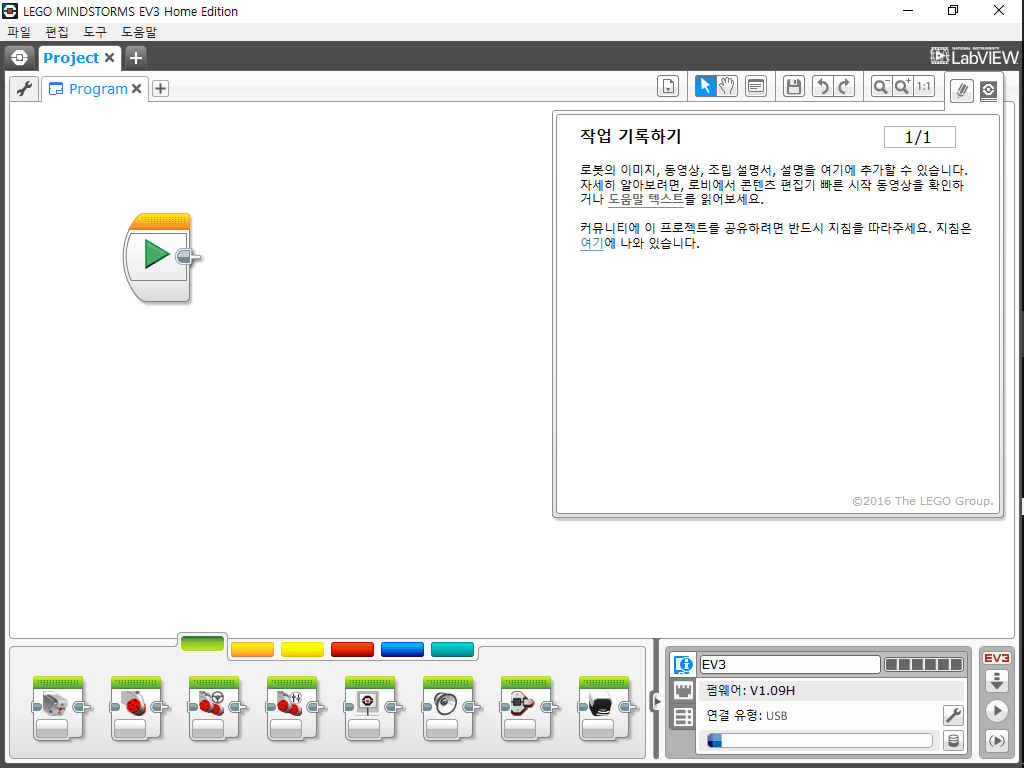 특히 레고 마인드스톰 EV3 소프트웨어는 알록달록한 블록 기반 인터페이스를 갖추고 있고, 한글 버전으로도 설치할 수 있어 프로그래밍을 처음 접하는 사람들도 쉽게 프로그램을 만들 수 있게 되어 있습니다.