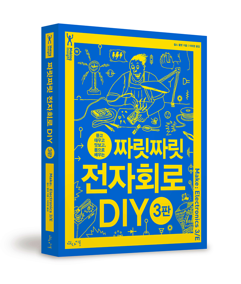 이 책은 이미 메이커들 사이에서 유명한 책인 《짜릿짜릿 전자회로 DIY(Make: Electronics)》의 3판입니다. 사전 지식이 전혀 없는 사람을 대상 독자로 하고 있어서 하나부터 열까지 모든 것을 설명해 줍니다. 우선 뭘 사야 되는지부터 하나하나 알려줍니다. 그게 왜 필요한지부터 전기전자에서 필요한 기본 개념, 용어의 어원까지 설명합니다. 이론 먼저 설명하는 책들과 달리 개념이 머리에 쏙쏙 들어옵니다! 실험 방법도 회로도만 제시하는 것이 아니라 회로도가 익숙하지 않은 초보자들을 위해 그림이나 사진으로 보여줍니다.