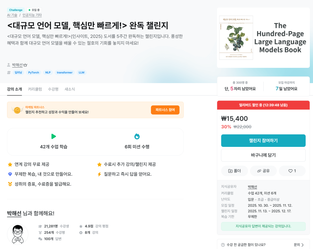 《대규모 언어 모델, 핵심만 빠르게!》 독자분들을 대상으로 완독 챌린지를 진행하고 있습니다. 완독 후 인증을 남겨주신 분들께는 추첨을 통해 강의 무료 쿠폰 및 할인 쿠폰을 증정합니다. 자세한 참여 방법은 인프런 사이트를 통해 확인하실 수 있습니다.